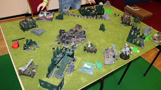 I apologize for a lack of blogging lately, but Big Kev's been a busy lad! Heres a battle report from last weeks club night, and its a special one! My opponent this week is the incredibly awesome Byron who is the chairman for the Crow Valley Crusaders who are based in Cwmbran. We fancied a nice big battle so 3000pts were decided and army lists made! I had no idea what Byron was going to take, he'd mentioned a lot of armies so I decided to just take what I fanced and be versatile. He did however mention a Caestus Assault Ram.... He then went on to tell me the rules and I have to be honest, I was concerned! The day of the battle came and I discovered an Imperial Guard force with Dark Angels allies. This was going to be brutal! Deployment below!
